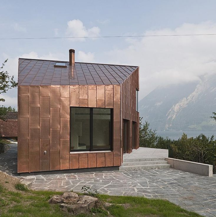 Das kupferverkleidete Holzhaus, ein Ersatzbau für ein baufälliges Gebäude aus den fünfziger Jahren, wurde grösstenteils auf dessen bestehenden Fundationen gebaut. Das Minimalhaus besteht hauptsächlich aus einem zweigeschossigen Wohnraum, der Küche, das Bad, der Schlaf- und der Gästeraum erscheinen sozusagen als „Nebenräume“. Durch die südseitigen Hebe-Schiebefenster wird durch einen Sehwinkel von 180° der Seespiegel erlebbar. Über die hochliegenden Fenster sieht man die nahe liegenden Berge wie der Rophaien, der Fronalpstock oder der Oberbauen Stock.